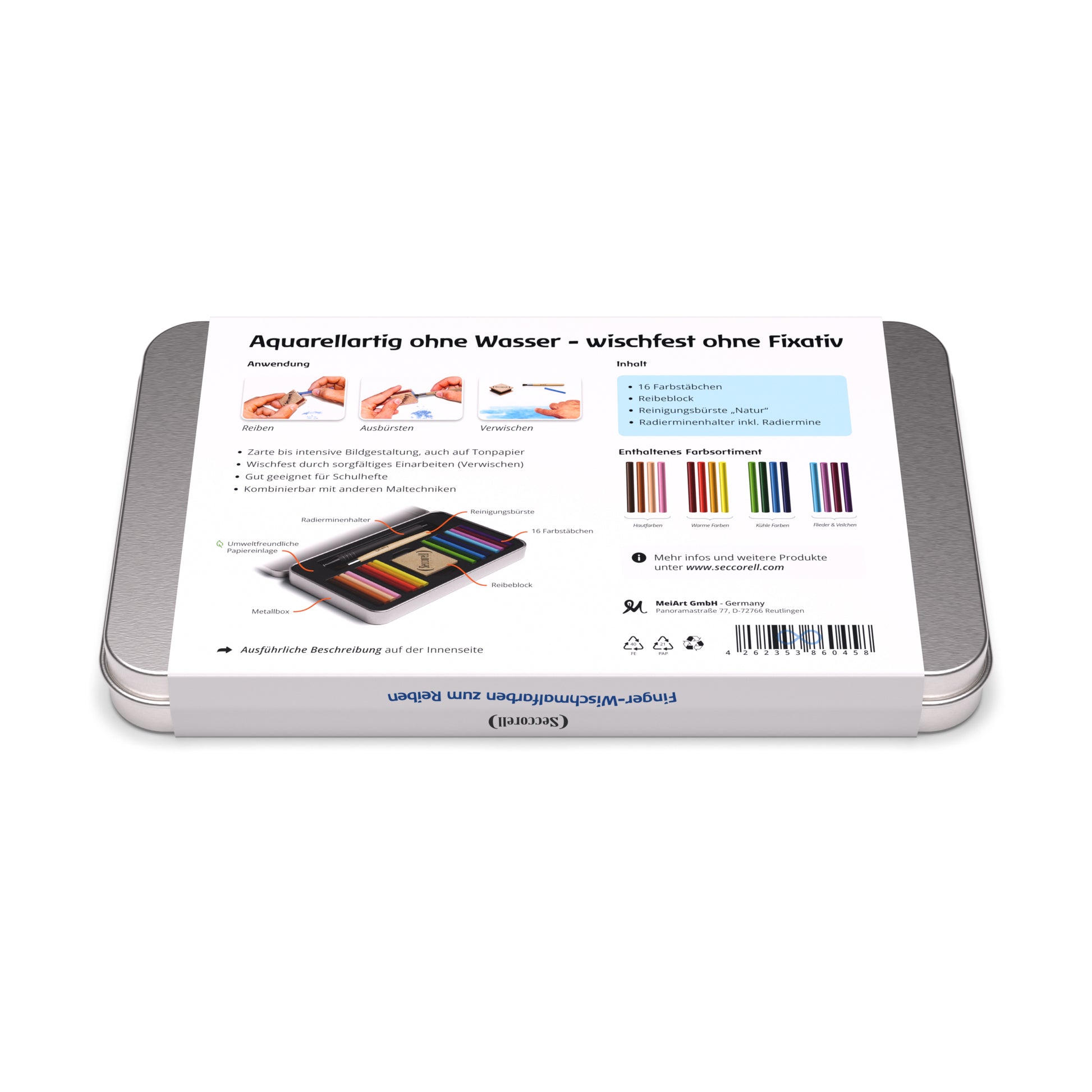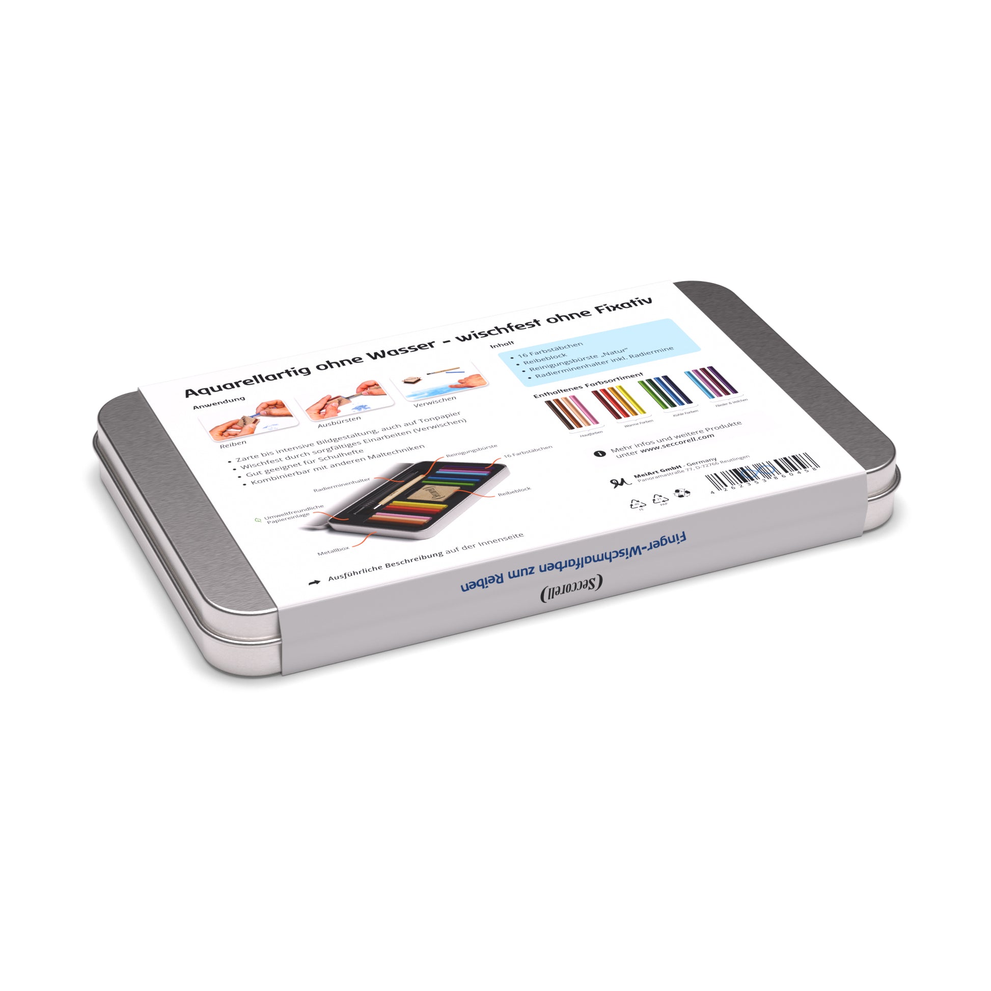 In der Metallbox sind Farben und Werkzeuge sicher in einem umweltfreundlichen Facheinsatz aus Faserguss-Papier eingebettet. Jedes Farbstäbchen hat seinen eigenen Platz, sodass alles übersichtlich geordnet und sofort griffbereit ist. Die Positionierung der Farben und Werkzeuge ist so durchdacht, dass auch beim Transport über Kopf nichts durcheinander geraten kann.